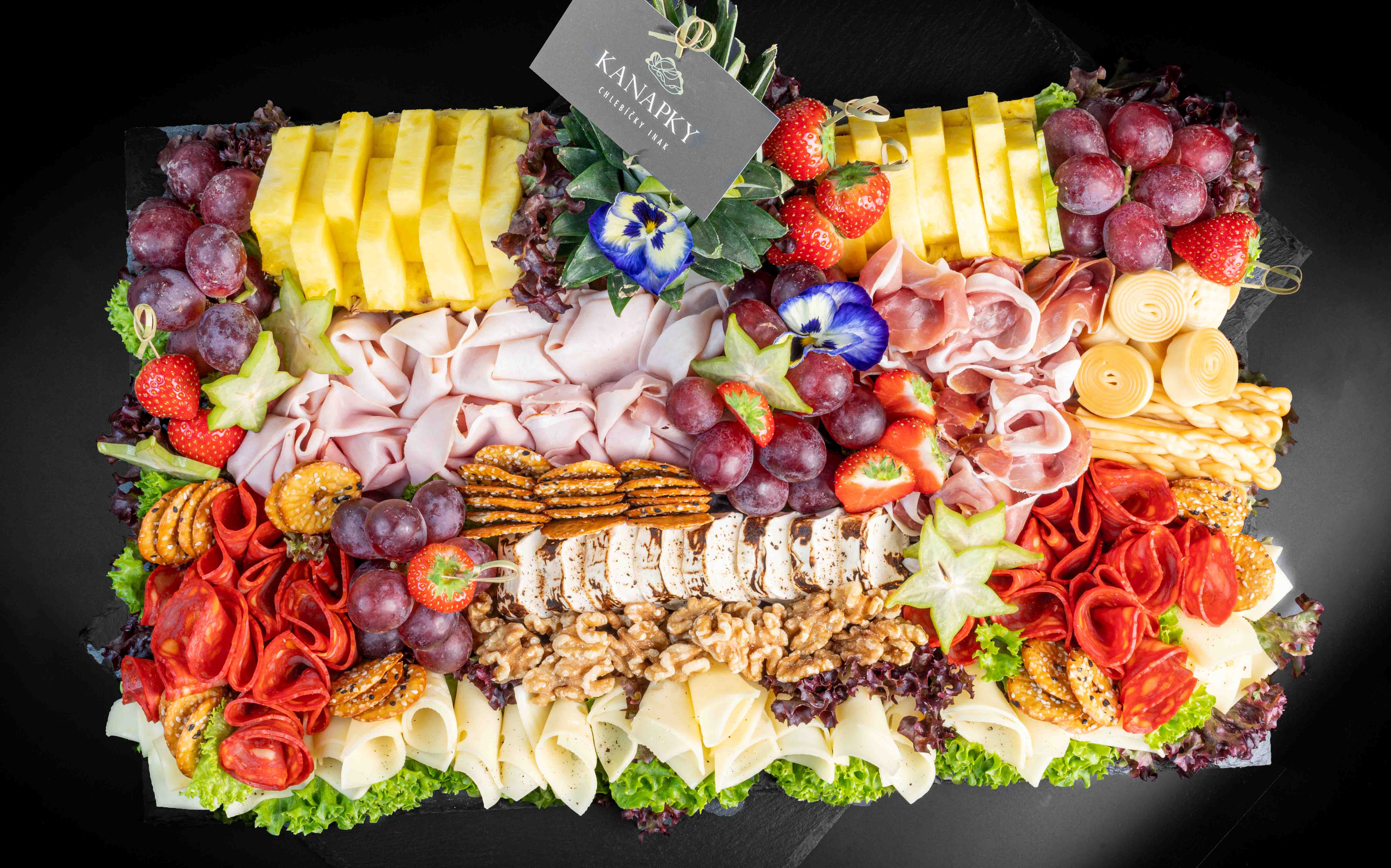 Výber sušených a čerstvých šuniek, salám a klobás, výber kravských, ovčích a kozích syrov, hrozno, sezónne ovocie, mix olív, cherry paradajky, mix orieškov